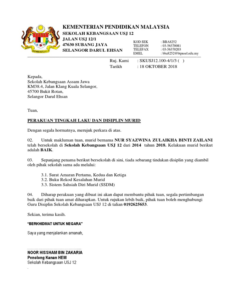 . Anak tuanpuan masih mengulangi perbuatan salahlaku yang melanggar peraturanperaturan pelajar. Surat pengesahan murid 03. Guru Besar Guru Disiplin Dan Guru Sekolah.